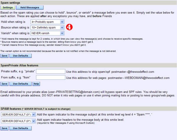 | 4)Section 4 allows you to set what to do with mail that has been scored. By default, when email is rated at 7 or above, it is put into the webmail 'held' folder. When email is rated at 15 or above, it is bounced back to the sender, warning them not to send SPAM. ** Please note: If you do not plan on using the webmail, and would rather use your own client (such as Outlook), then set 'Hold' to 'Never'. This will not use the server side Webmail held folder to store SPAM. |